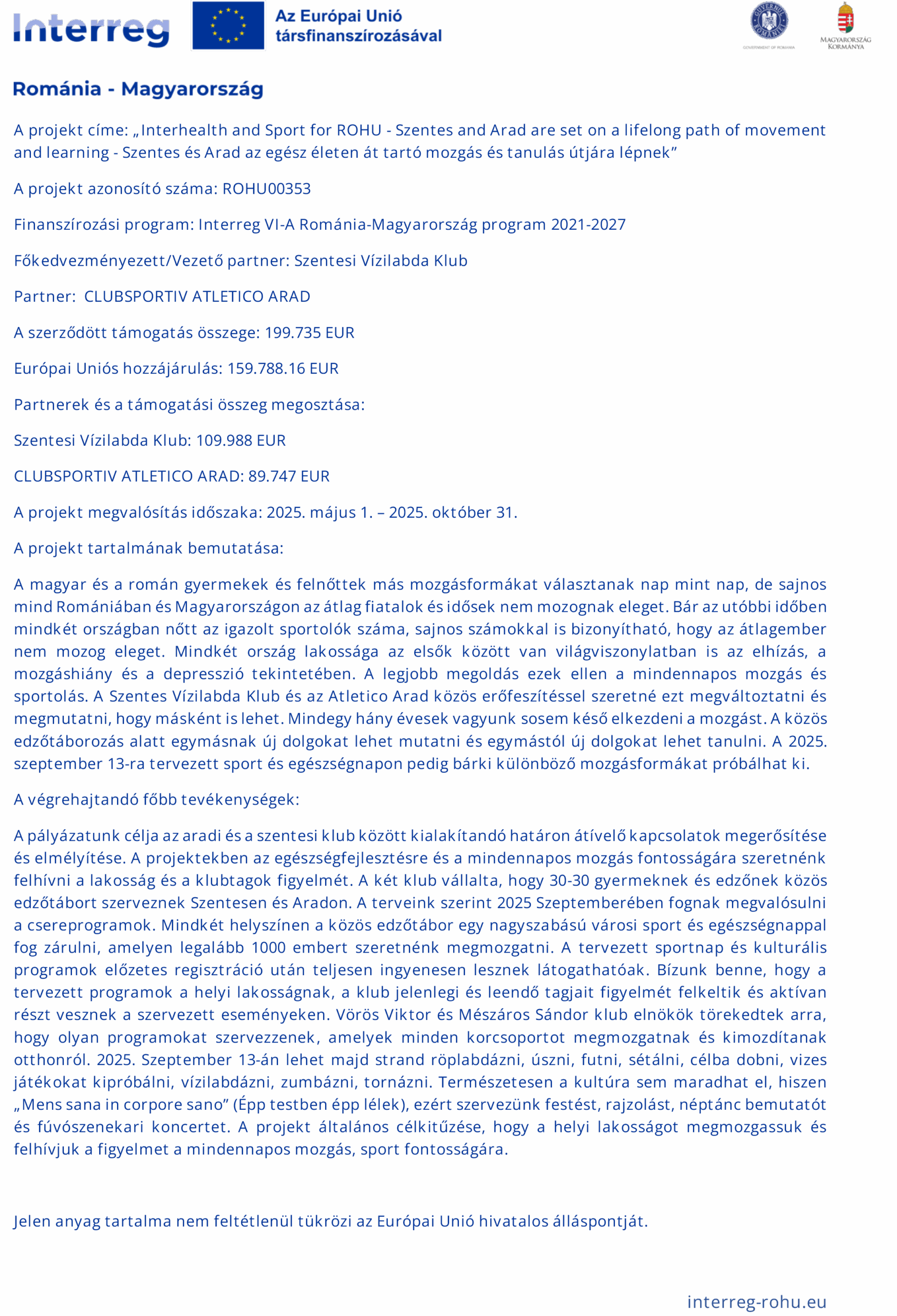 A projekt címe: "Interhealth and Sport for ROHU - Szentes és Arad egy életen át tartó mozgás és tanulás útjára lépnek - Szentes és Arad az egész életen át tartó mozgás és tanulás útjára lépnek"
