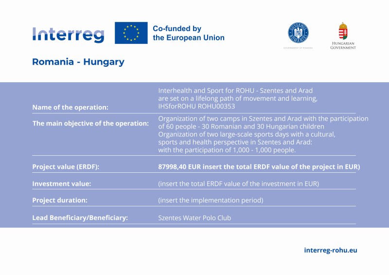 We are pleased to announce that the joint ROHU project application submitted by the Szentes Water Polo Club and the CLUBSPORTIV ATLETICO ARAD football team has been successfully approved. The preparation and submission of the proposal required extensive preliminary work, and we are proud that the Interreg ROHU00353 – IHSforROHU project can now be implemented until 31 October 2025.